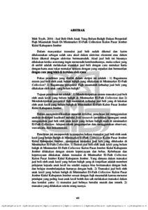 Moh Toyib, 2016 : Jual Beli Oleh Anak Yang Belum Baligh Dalam Perspektif Fiqh Muamalah Studi Di Minimarket El-Fath Collection Kulon Pasar Jember Kidul Kabupaten Jember Dalam masyarakat transaksi jual beli sudah dikenal dan lazim dilaksanakan sebagai salah satu akad dalam aktivitas ekonomi atau dalam Islam dikenal dengan aktivitas bermuamalah. Akad jual beli ini biasanya dilakukan ketika seseorang ingin memenuhi kembutuhannya, maka solusi yang di ambil adalah melakukan transaksi jual beli dengan cara menukar harta dengan harta atau tukar menukar sesuatu dengan yang sepadan dan bermanfaat dengan cara yang telah di tentukan oleh syara’. Fokus penelitian yang diteliti dalam skripsi ini adalah : 1) Bagaimana sistem jual beli oleh anak belum baligh yang dilakukan di Minimarket El-Fath Collection? 2) Bagaimana perspektif Fiqh muamalah terhadap jual beli yang dilakukan oleh anak yang belum baligh? Tujuan penelitian ini adalah : 1) Mendeskripsikan sistem transaksi jual beli oleh anak kecil yang belum baligh di Minimarket El-Fath Collection dan 2) Mendeskripsikan perspektif fiqh muamalah terhadap jual beli yang di lakukan oleh anak kecil yang belum baligh di Minimarket El-Fath Kulon Pasar Jember Kidul Kabupaten Jember. Dalam mengindetifikasikan masalah tersebut, penelitian ini menggunakan analisis deskriptif kualitatif melalui field research (penelitian lapangan) untuk menganalisis jual beli oleh anak kecil yang belum baligh studi di minimarket El-Fath Collection. Adapun teknik pengumpulan data menggunakan observasi, wawancara, dan dokumentasi. Penelitian ini memperoleh kesimpulan bahwa transaksi jual beli oleh anak kecil yang belum baligh di Minimarket El-Fath Collection Kulon Pasar Jember Kidul Kabupaten Jember merupakan transaksi jual beli yang dilakuakn di Minimarket El-Fath Collection. 1) Sistem jual beli oleh anak kecil yang belum baligh di Minimarket El-Fath Collection Kulon Pasar Jember Kidul Kabupaten Jember dilakukan dengan sistem kepercayaan dan bebas. Kebebasan dan kepercayaan dilakukan dalam transaksi di Minimarket El-Fath Collection Kulon Pasar Jember Kidul Kabupaten Jember. Yang dimana dalam transaksi jual beli oleh anak kecil yang belum baligh yang di tonjolkan adalah memberi pelajaran kepada anak kecil itu sendiri supaya bisa bertransaksi dengan baik dan belajar membelanjakan hartanya dengan baik. 2) Transaksi jual beli oleh anak kecil yang belum baligh di Minimarket El-Fath Collection Kulon Pasar Jember Kidul Kabupaten Jember sesuai dengan fiqh muamalah karena menurut pendapat yang paling kuat anak kecil boleh dan sah melakukan transaksi dalam dua kondisi yaitu: 1) transaksi jual belinya bersifat murah dan remeh. 2) transaksi yang dilakukan seizin orang tuanya